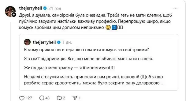 Так, у Threads виконавиця вийшла на зв’язок після низки гнівних коментарів під дописом, де вона писала про “монетизацію травм” без допомоги психологів, а завдяки творчості. Jerry Heil одразу наголосила, що її слова були сприйняті занадто буквально й насправді вона просто іронізувала. Тож після непорозуміння зірка перепросила у тих, кого допис зачепив.