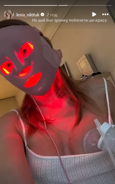 У своєму Instagram в Stories Нікітюк неочікувано показалася в масці з червоним світлом та з молоковідсмоктувачем. “Не дай Бог зранку побачити цю красу”, – з гумором підписала світлину ведуча.