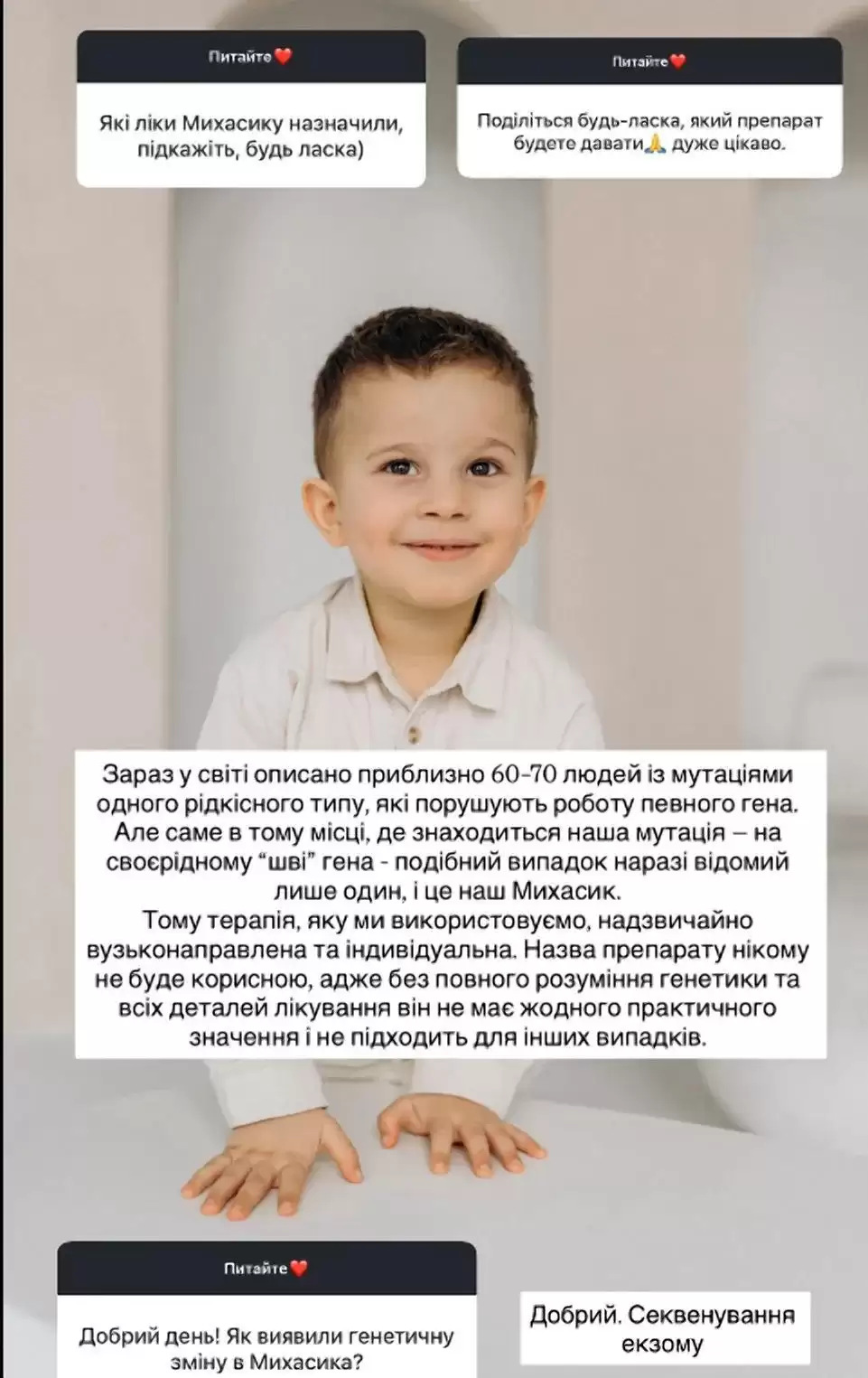 “Мутація розташована на так званому ‘шві’ гена. Такий варіант поки що описано лише один раз — у нашого Михасика. Тому терапія, яку ми застосовуємо, дуже специфічна та розроблена індивідуально”, — розповіла Репяхова.