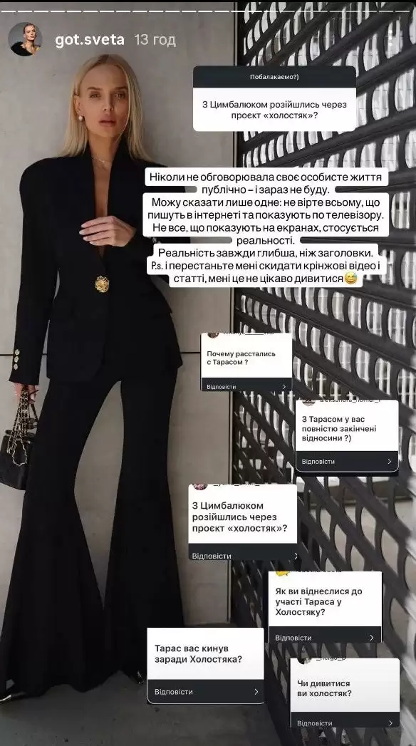 У своєму Instagram вона відповіла на запитання підписників, які поцікавилися, чи не через участь актора в шоу припинилися їхні стосунки.
