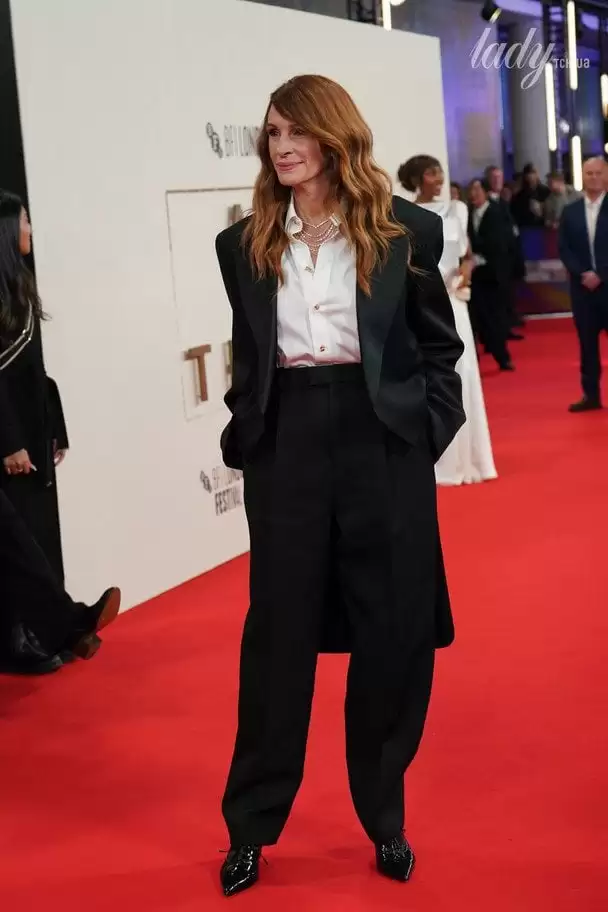 57-річна акторка обрала для світського виходу елегантну білу сорочку із золотими ґудзиками, чорний фрак та класичні штани, які стилізувала з лакованими гостроносими чоботями на підборах.