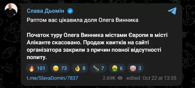 Зокрема, цього тижня телеведучий Слава Дьомін звернув увагу, що початок туру артиста в іспанському Аліканте скасовано. За його словами, через низький попит на квитки. Проте Олег заперечив чутки.