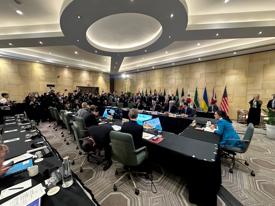 «Завтрашній день ми розпочнемо із зустрічі з міністром закордонних справ України, щоб підтвердити нашу колективну підтримку на тлі російської агресії», – сказала перед відкриттям саміту його господарка, міністерка закордонних справ Канади Аніта Ананд.
