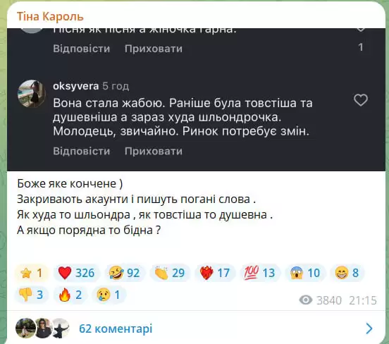“Боже, яке кончене. Закривають акаунти й пишуть погані слова. Як худа – то шльондра, як товстіша – то душевна. А якщо порядна – то бідна?” – парирувала зірка.