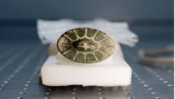 Рентгенівський аналіз виявив у канавках рукояті не олово, як припускали спершу, а інкрустації з мідного дроту. Це свідчить про високий рівень металургії бронзової доби. «Це було несподіванкою… і показує, наскільки високо розвиненою була ремесленність», — підкреслила Гербольд. Контраст між червонуватою міддю та золотистою бронзою, ймовірно, посилювали патинуванням.