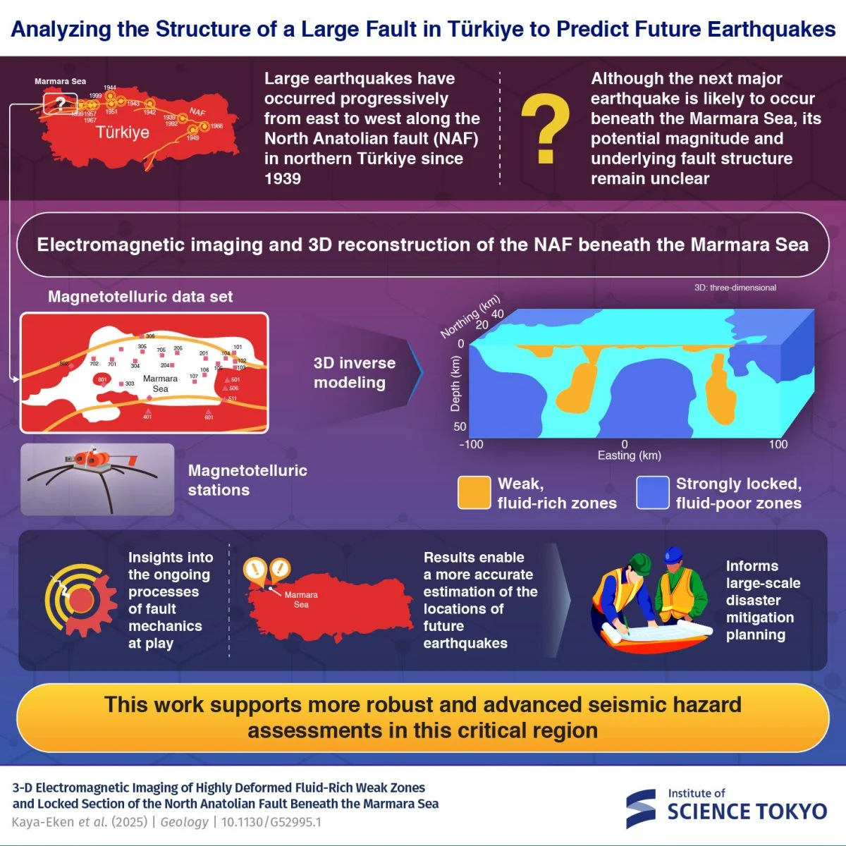 Сьогодні найбільше занепокоєння викликає ділянка розлому під Мармуровим морем, яка не вивільняла напругу понад 250 років. Саме тут міжнародна група вчених створила першу тривимірну модель питомого електричного опору земної кори. Результати опубліковані в журналі Geology і дають нове бачення механіки розломів.